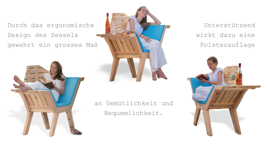 Wegen der Großzügigkeit des Sessels und seines ergonomischen Designs findet man schnell eine Sitzposition in der man bequem die Seele baumeln lassen kann. Sei es seitlich, schräg oder aufrecht gegen die austarierte Rücklehne angelehnt. Die hohe Rücklehne gibt das Gefühl von Geborgenheit und Heimeligkeit. Unterstützend zur Bequemlichkeit wirkt auch noch eine Auflage in der Höhe von 4 cm.